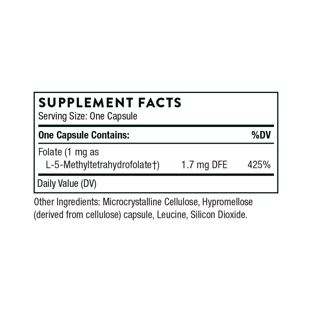 Unlike folic acid, 5-MTHF is the active form of folate the body can use directly—no conversion required. Thorne’s 5-MTHF 1 mg is formulated for high absorption, purity, and clinical reliability, making it suitable for integrative and practitioner-guided supplementation.