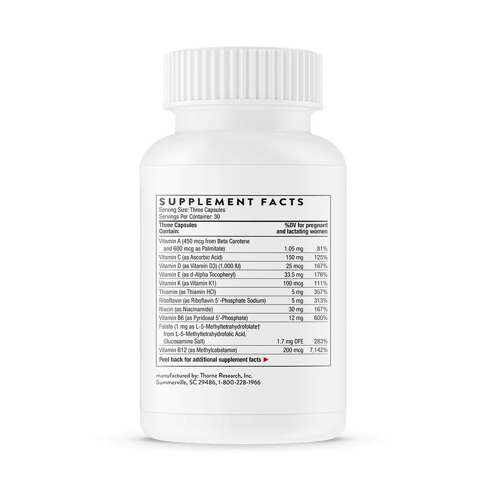 Basic Prenatal® Capsules by Thorne is a comprehensive prenatal multivitamin designed to support maternal nutrition before, during, and after pregnancy, including lactation. This professional-grade formula provides essential vitamins and minerals in highly absorbable forms to support fetal development, maternal health, and nutritional adequacy as part of a balanced diet and healthy lifestyle.