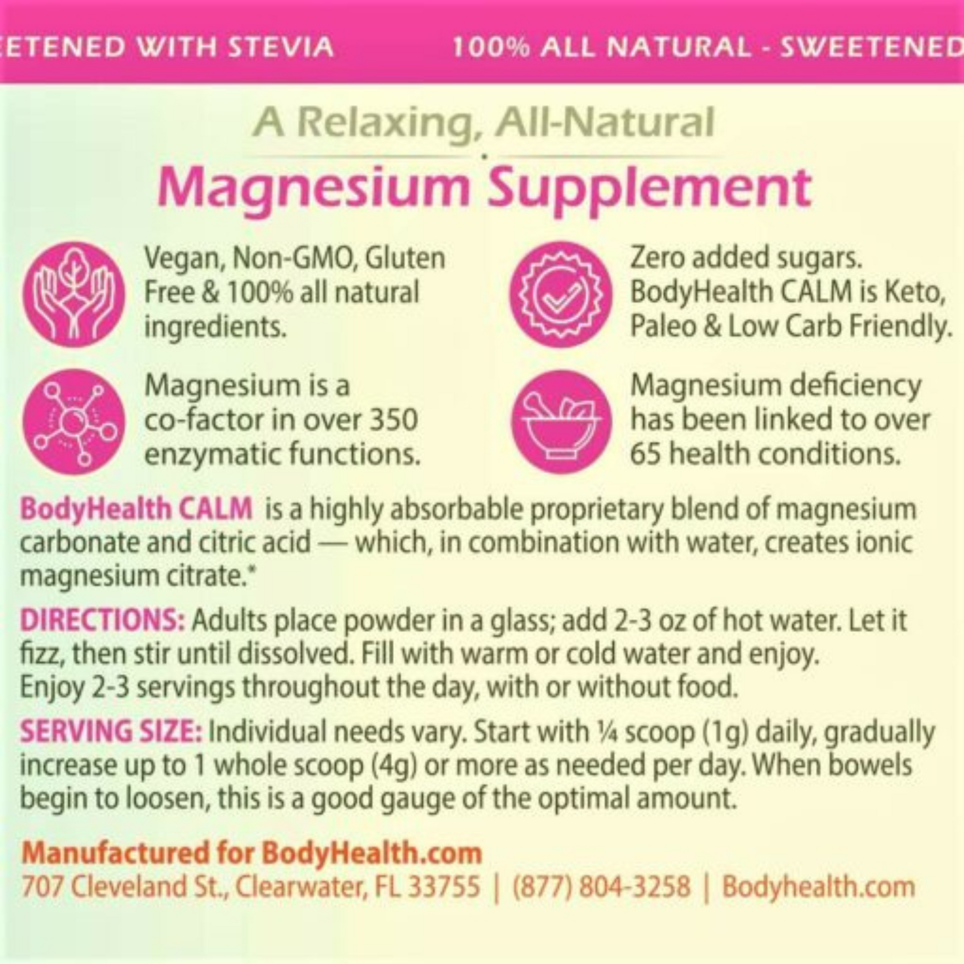 The perfect stress reduction formula. Calm by Body Health is a delicious berry & lemon flavored magnesium powder to help you relax and unwind from the day.