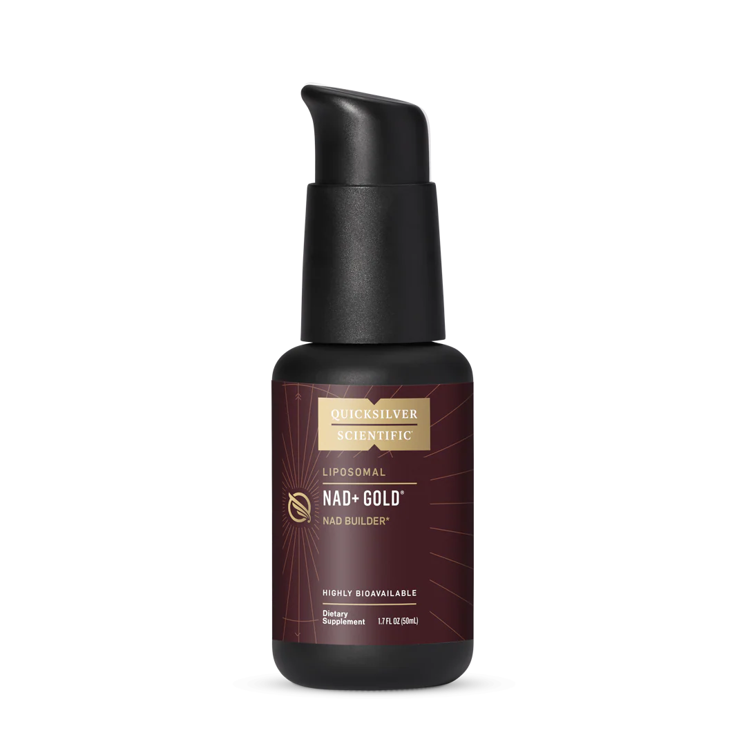 NAD+ Gold by QuickSilver Scientific supports metabolism, energy production, and brain health through advanced NAD+ boosting. This unique liposomal NMN formulation offers rapid absorption, efficiently restoring declining NAD+ levels crucial for cellular defense and activation of anti-aging genes.